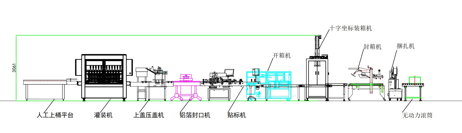 主要是人工上桶-灌裝機-上蓋壓蓋-鋁箔封口-貼標機-開箱機-裝箱機-封箱機-捆扎機。價格可以根據這個方案的設備決定。還可以根據工廠配備人工來定不同的流水線。價格在5-25萬左右,具體價格以銷售方案報價為準。